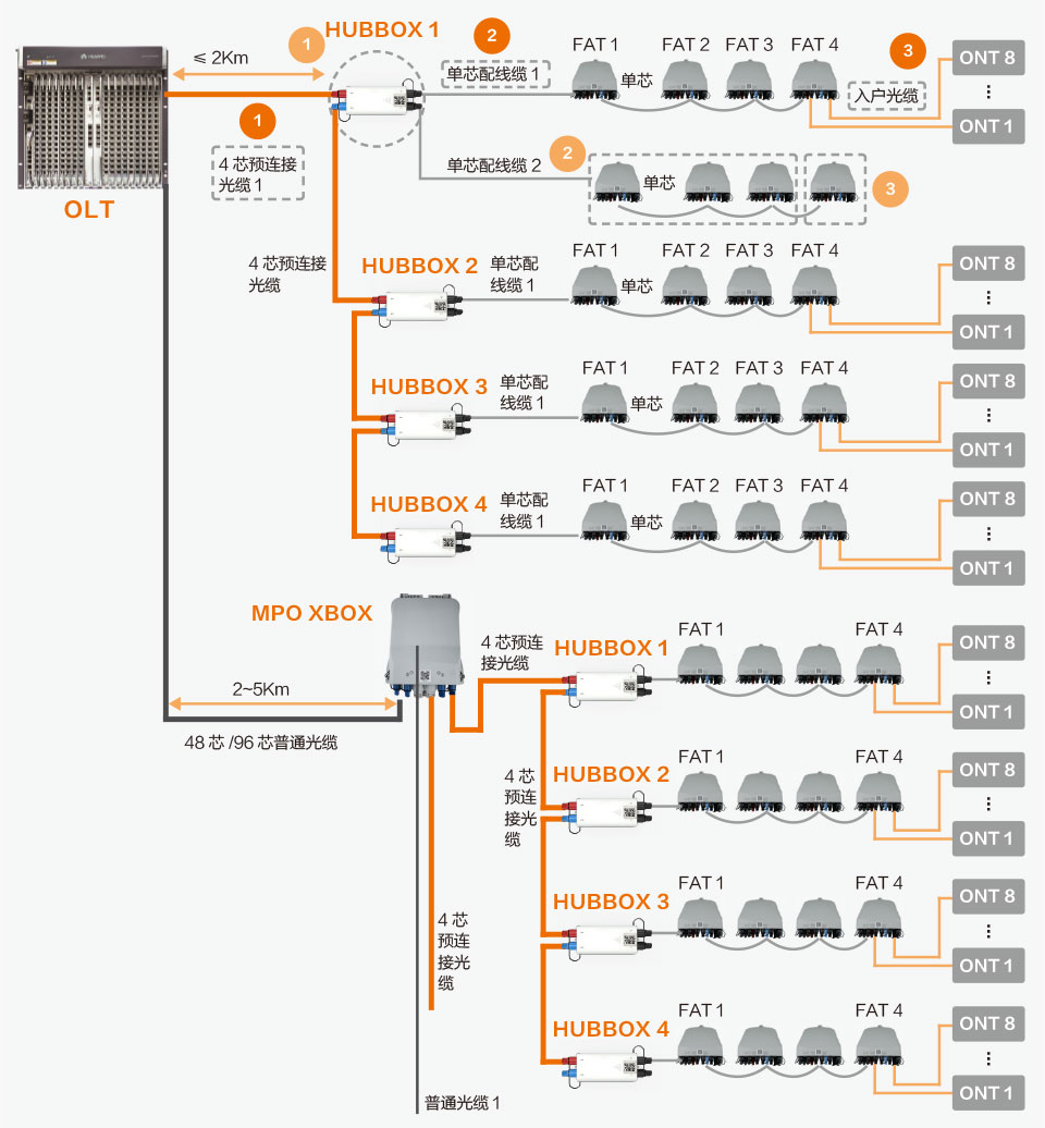 此方案(如圖9)包含三個(gè)盒子,即HUBBOX、SUBBOX、ENDBOX和三根纜,即MPO光纜、單芯配線纜、入戶光纜。每個(gè)HUBBOX對(duì)4個(gè)GPON口的纖芯進(jìn)行1:2分光,輸出8條鏈路。SUBBOX是不等比分光,可級(jí)聯(lián)4個(gè)FAT,每個(gè)FAT可連接8個(gè)用戶。離OLT較遠(yuǎn)的區(qū)域可用普通光纜+MPO XBOX方案,XBOX不僅可以直接與12芯預(yù)連接光纜相連,還可以與普通光纜連接輸出。方案全程預(yù)連接,非常適合架空?qǐng)鼍,安裝效率高、故障率低。
