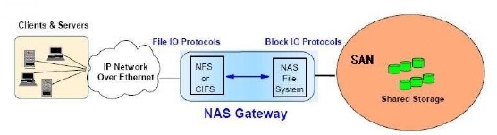 上的SAN上,使的SAN的大容量存儲空間可以為NAS所用。因此,NAS網(wǎng)關(guān)后面的存儲空